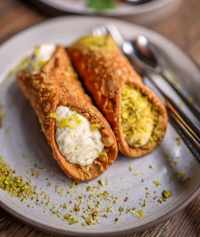 Ręcznie robione, smażone na świeżo, wypełnione lekkim kremem z ricotty, wanilii i odrobiny pomarańczy. Na końcach chrupiąca pistacja i skórka z sycylijskiej cytryny. Ustawione na rustykalnej paterze – wyglądają jak z trattorii.